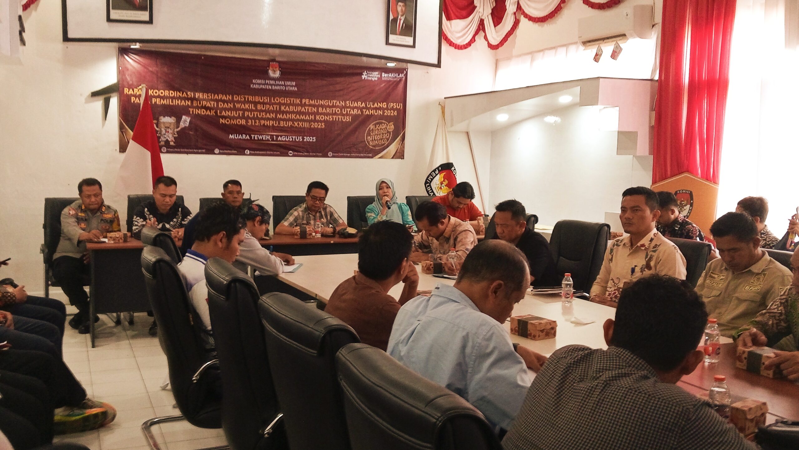 MUARA TEWEH, KALIMANTANLIVE.COM – Rapat Koordinasi Persiapan Distribusi Logistik Pemungutan Suara Ulang (PSU) diadakan KPU Kabupaten Barito Utara menjelang hari pemungutan suara 6 Agustus 2025 mendatang, pada Jum’at, 1 Agustus 2025 Sore, di Aula Kantor KPU Barut, Muara Teweh.