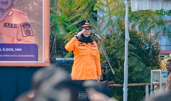 Wali Kota Banjarbaru, Hj. Erna Halaby, memimpin langsung Apel Siaga Bencana Tahun 2025 di Lapangan dr. Murdjani, Selasa (5/8/2025).