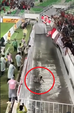 Namun, ketika melompat di depan penonton, ia justru terjatuh ke parit pembatas yang cukup dalam. Aksi itu sontak mengundang tawa dan sorakan kaget dari penonton.