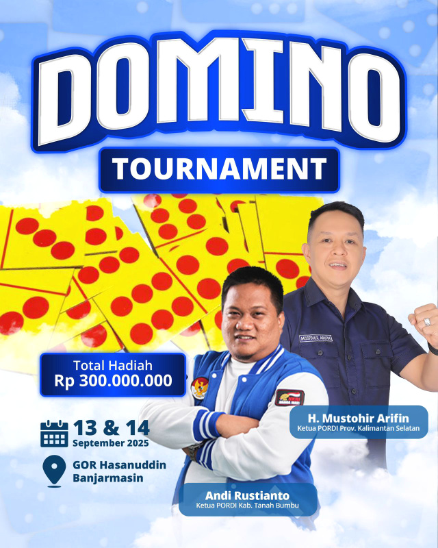 KOTABARU, Kalimantanlive.com – Dalam rangka memperingati Hari Ulang Tahun ke-80 Republik Indonesia, Persatuan Olahraga Domino Indonesia (PORDI) Kalimantan Selatan, menggelar turnamen domino yang akan dilaksanakan tanggal 13 sampai dengan 14 september mendatang, di Gor Hasanuddin Banjarmasin.