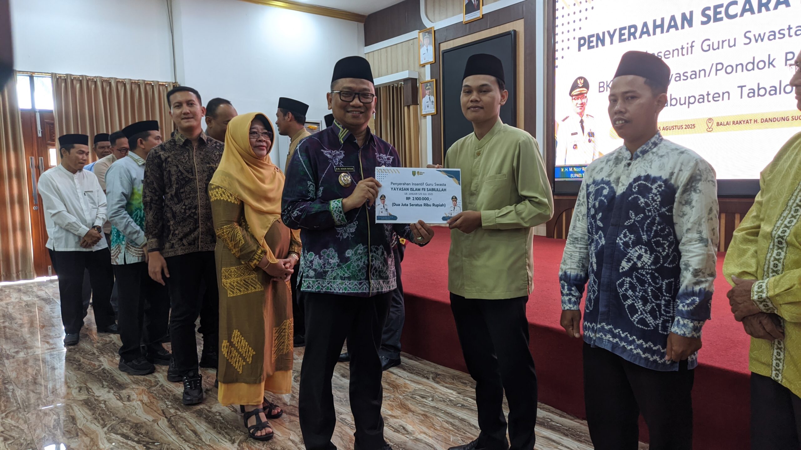 Penyerahan insentif ini sceara simbolis diserahkan Bupati Tabalong, H Muhammad Noor Rifani kepada perwakilan guru swasta berlangsung di Balai Dandung Suchrowardi, Jum’at (15/8/2025).