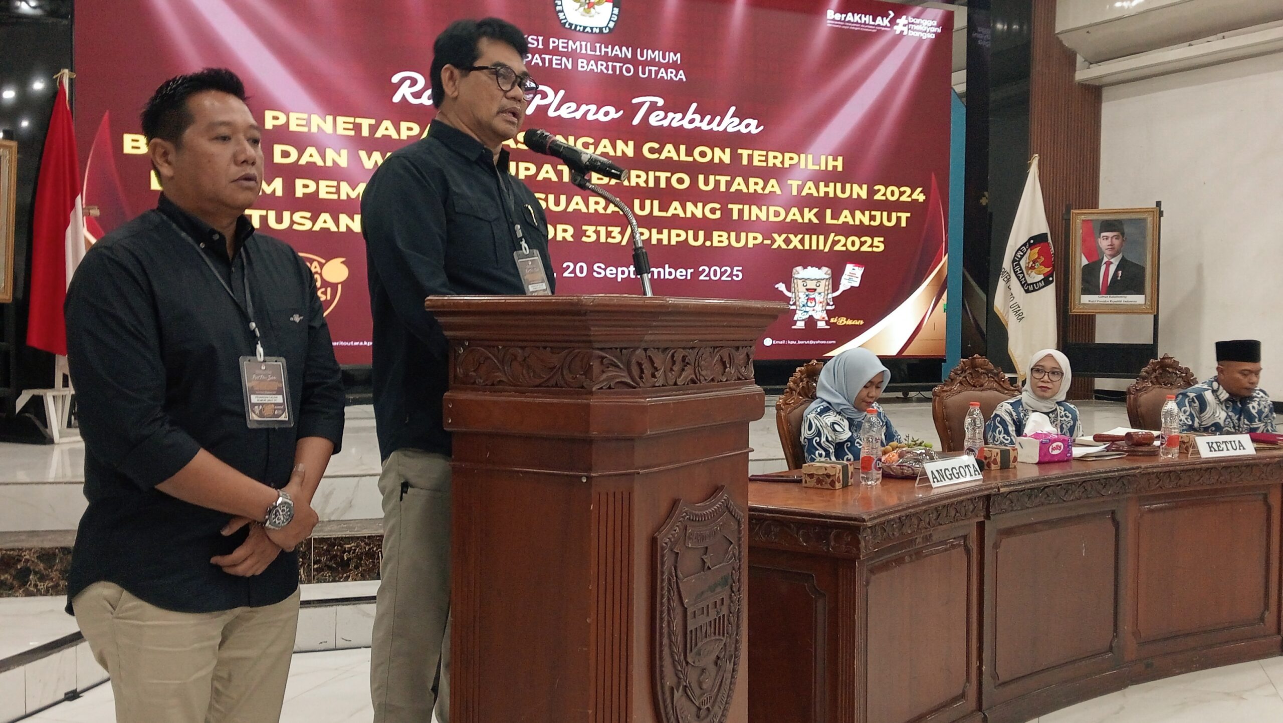 “Ketua Komisi Pemilihan Umum Kabupaten Barito Utara, Menimbang dan seterusnya, mengingat dan seterusnya, memutuskan, menetapkan Keputusan Komisi Pemilihan Umum Kabupaten Barito Utara, Tentang Penetapan Pasangan Calon Bupati dan Wakil Bupati Terpilih Kabupaten Barito Utara Tahun 2024, pada Pemungutan Suara Ulang tindak lanjut Putusan Mahkamah Konstitusi terhadap perselisihan hasil pemilihan perkara nomor 313/PHPU.BUP-XXIII/2025,” baca Siska.