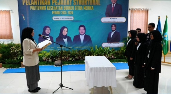 PELAIHARI, Kalimantanlive.com – Pelantikan Direktur Politeknik Kesehatan Borneo Citra Medika (Poltekkes BCM), Ratih Indah Sari yang digelar oleh Yayasan Bersama Harapan Bangsa Berau dilaksanakan di Aula RS BCM Pelaihari, pada Selasa (23/09/2025).