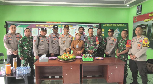 Pemberian ucapan Selamat HUT disambut langsung personel Koramil Kelumpang Hilir Serma Shalahudin dan beberapa personel Koramil.