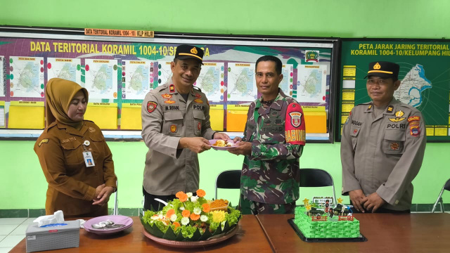 KOTABARU, Kalimantanlive.com – Kepala Kepolisian Sektor (Kapolsek) Kelumpang Hilir Iptu M Rifani memberikan nasi tumpeng ke personel Koramil 1004-10 Kelumpang Hilir, Senin (6/10/2025).