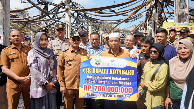 KOTABARU, Kalimantanlive.com – Sebagai wujud kepedulian Bupati Kotabaru H.Muhammad Rusli, S. Sos menyampaikan rasa duka sekaligus menyerahkan bantuan CSR Bank Kalsel kepada 167 kios pedagang terdampak, berupa uang senilai total Rp. 700 juta. Selasa (07/10/2025).