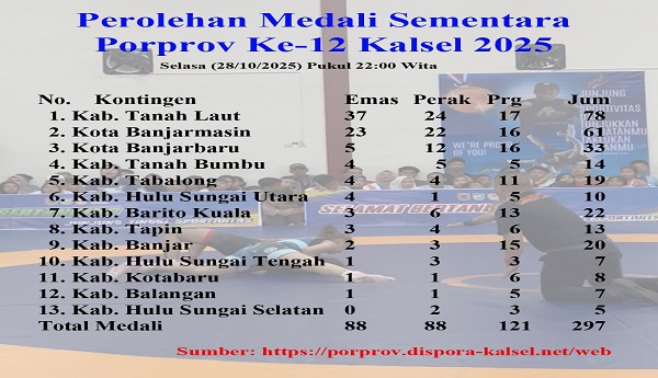 Berdasarkan data resmi dari website Dinas Kepemudaan dan Olahraga (Dispora) Kalsel, Kabupaten Tala berada di posisi pertama dengan capaian 37 medali emas, 24 perak, dan 17 perunggu.