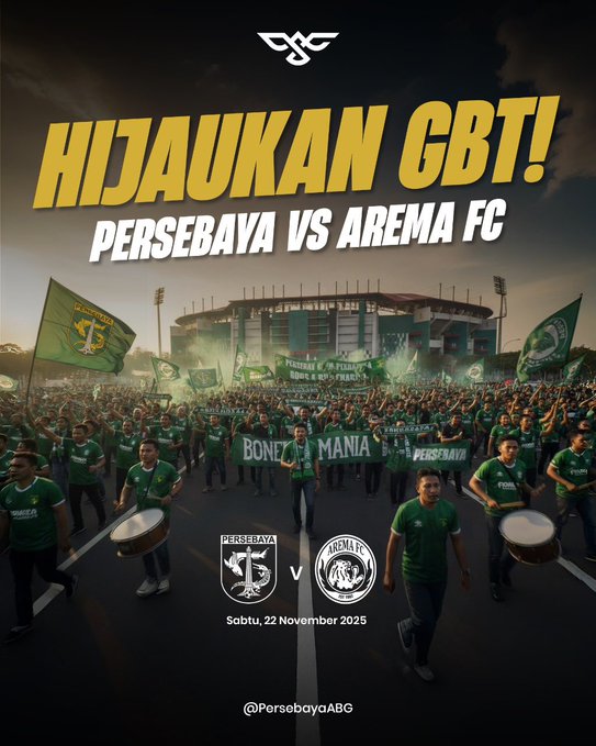 JAKARTA, KALIMANTANLIVE.COM – Duel sarat gengsi kembali membara! Derbi Jawa Timur antara Persebaya Surabaya vs Arema FC siap mengguncang pekan ke-13 Super League 2025–2026. Pertandingan panas penuh rivalitas ini akan berlangsung di Stadion Gelora Bung Tomo (GBT), Sabtu (22/11/2025) pukul 15.30 WIB.