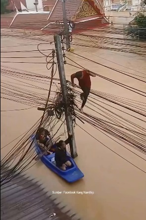 KALIMANTANLIVE.COM – Banjir raksasa kembali menghantam Bangkok, memicu aksi nekat warga yang mempertaruhkan nyawa demi bertahan hidup. Sebuah unggahan viral dari Thailand pada Selasa (25/11/2025) memperlihatkan penduduk yang memanjat kabel listrik dan kabel komunikasi sebagai satu-satunya cara keluar dari kawasan yang tenggelam hingga mencapai lantai dua bangunan.
