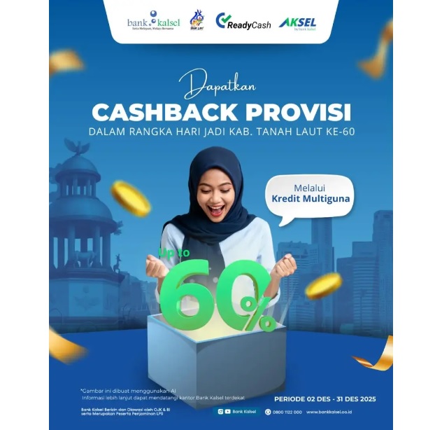 TANAH LAUT, Kalimantanlive.com — Dalam rangka memeriahkan Hari Jadi Kabupaten Tanah Laut ke-60, Bank Kalsel menghadirkan Promo Cashback Provisi Kredit Multiguna hingga 60% bagi masyarakat Tanah Laut. Program spesial ini berlangsung selama periode 2–31 Desember 2025 dan menjadi bentuk nyata komitmen Bank Kalsel dalam mendukung peningkatan kesejahteraan ekonomi masyarakat daerah.