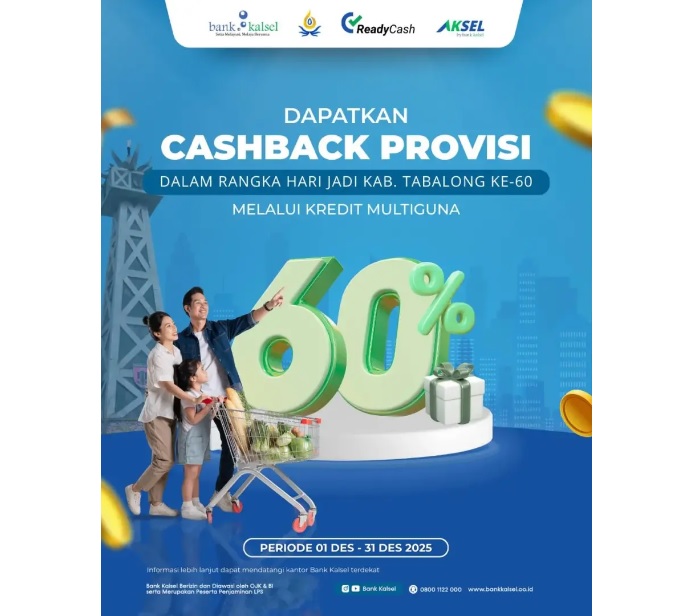 TANJUNG, Kalimantanlive.com – Dalam rangka memeriahkan Hari Jadi Kabupaten Tabalong ke-60, Bank Kalsel menghadirkan program spesial berupa Promo Cashback Provisi Kredit Multiguna hingga 60%. Promo ini berlaku selama periode 1–31 Desember 2025 dan menjadi bentuk apresiasi Bank Kalsel kepada masyarakat Tabalong sekaligus dukungan nyata dalam mempermudah akses pembiayaan.