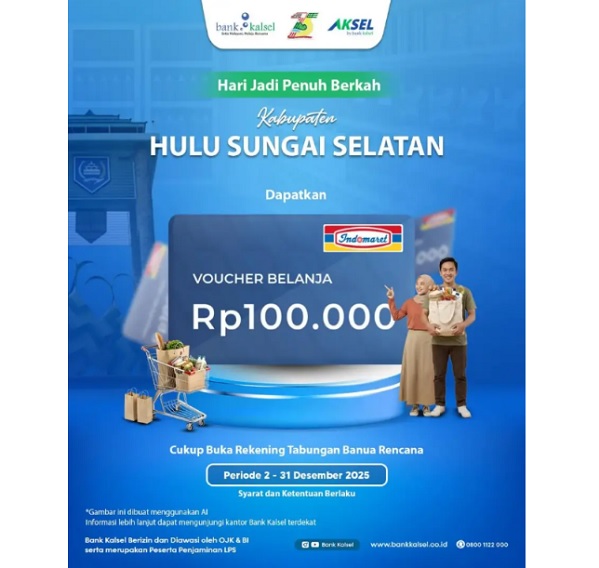 “Melalui program khusus ini, masyarakat yang membuka rekening Tabungan Banua Rencana berkesempatan mendapatkan hadiah langsung berupa Voucher Indomaret atau Paket Sembako senilai Rp100.000. Program ini berlangsung mulai 2 hingga 31 Desember 2025 dan berlaku bagi nasabah Bank Kalsel Konvensional,” ujarnya.