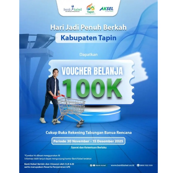 Program promo ini berlaku secara terbatas mulai 30 November hingga 15 Desember 2025 dan dapat dimanfaatkan oleh nasabah baru maupun nasabah eksisting. Kehadiran program ini menjadi bentuk apresiasi Bank Kalsel kepada masyarakat Kabupaten Tapin atas kepercayaan dan dukungan yang selama ini diberikan kepada Bank Kalsel sebagai mitra layanan keuangan daerah.