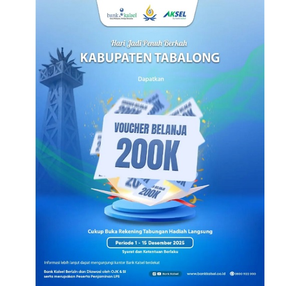 TABALONG, Kalimantanlive.com — Dalam rangka memeriahkan peringatan Hari Jadi Kabupaten Tabalong ke-60 yang mengusung tema “Kolaborasi, Sinergi, dan Inovasi untuk Tabalong SMaRT”, Bank Kalsel menghadirkan program promo spesial Tabungan Hadiah Langsung yang memberikan voucher belanja senilai Rp200.000 bagi masyarakat yang membuka rekening baru.