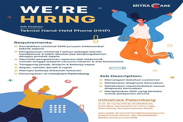 Adapun posisi yang dibutuhkan meliputi Teknisi Hand-Held Phone (HHP), Teknisi Consumer Electronic (CE), serta Admin Spare Part.