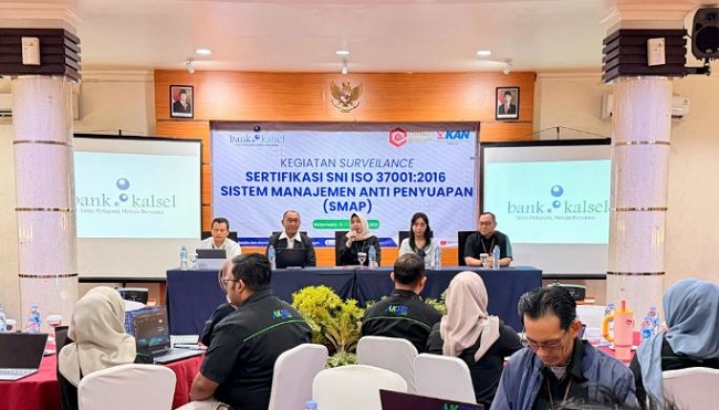 BANJARMASIN, Kalimantanlive.com — Dalam rangka menegaskan komitmen terhadap penerapan tata kelola perusahaan yang baik serta bertepatan dengan peringatan Hari Anti Korupsi Sedunia (HAKORDIA) Tahun 2025 pada 9 Desember 2025 lalu, Bank Kalsel melaksanakan kegiatan Surveillance Sertifikasi SNI ISO 37001:2016 Sistem Manajemen Anti Penyuapan (SMAP) pada 10–11 Desember 2025 bertempat di Hotel Aquarius, Banjarmasin.