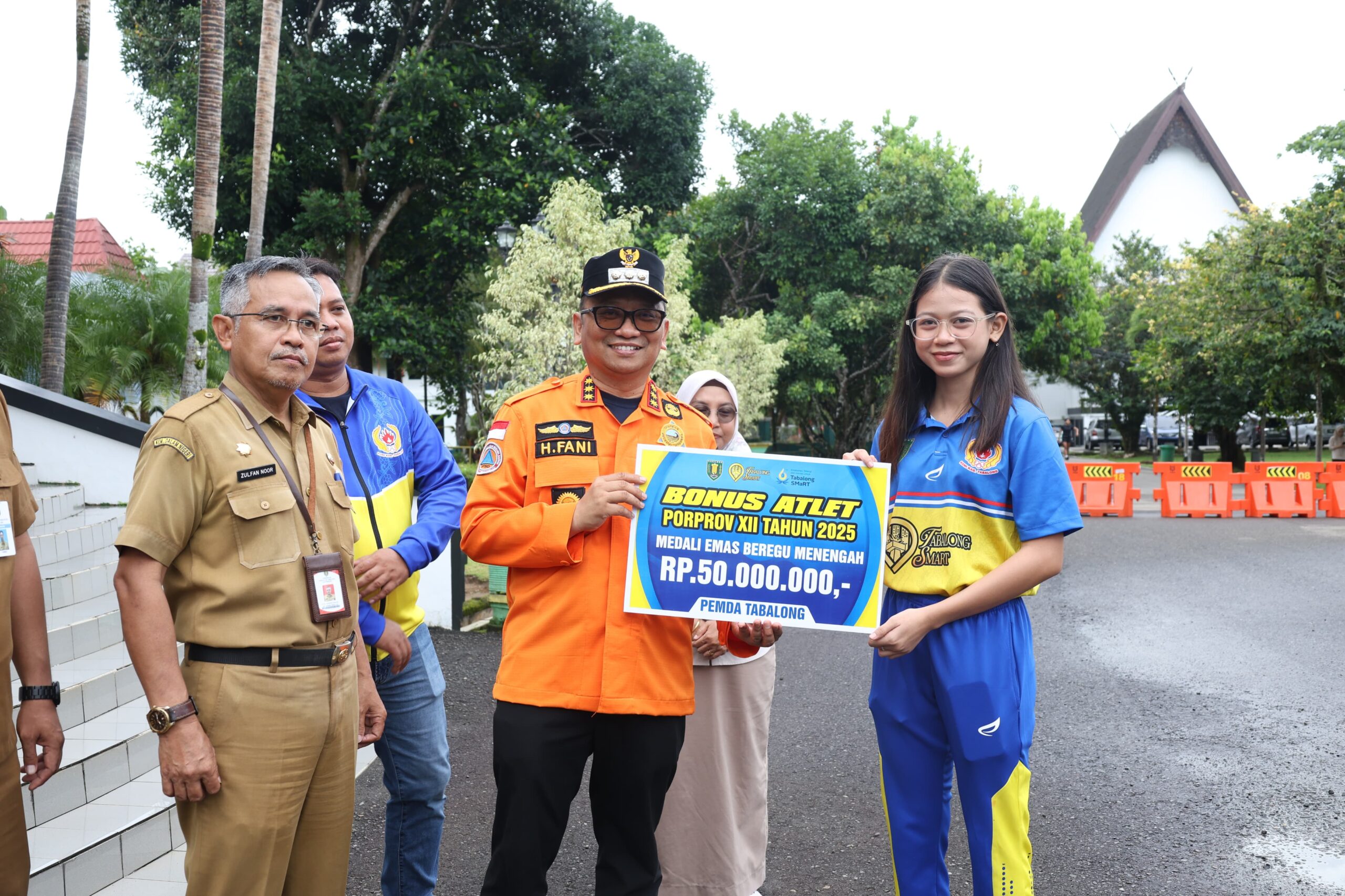 Bonus ini secara simbolis diserahkan Bupati Tabalong, H Muhammad Noor Rifani, didampingi Kepala Disporapar Tabalong, Zulfan Noor, Ketua KONI Tabalong, Irwan Hidayat di Halaman Kediaman Dinas Bupati, Selasa (30/12/2025).