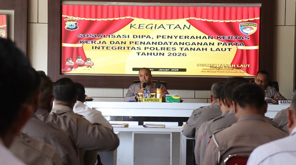 PELAIHARI, Kalimantanlive.com – Polres Tanah Laut mulai memantapkan langkah pelaksanaan program dan pengelolaan anggaran Tahun 2026 melalui kegiatan Sosialisasi Daftar Isian Pelaksanaan Anggaran (DIPA), penyerahan kertas kerja, serta penandatanganan Pakta Integritas. Kegiatan tersebut digelar di Joglo Wicaksana Laghawa Mapolres Tanah Laut, Rabu (14/1).