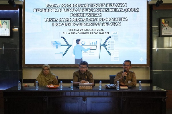 BANJARBARU, Kalimantanlive.com — Dinas Komunikasi dan Informatika (Diskominfo) Provinsi Kalimantan Selatan menggelar Rapat Koordinasi Teknis Pegawai Pemerintah dengan Perjanjian Kerja (PPPK) Paruh Waktu sebagai upaya menyamakan pemahaman terkait mekanisme, kriteria, serta tindak lanjut kebijakan PPPK Paruh Waktu di lingkungan Diskominfo Kalsel, Selasa (27/1/2026).