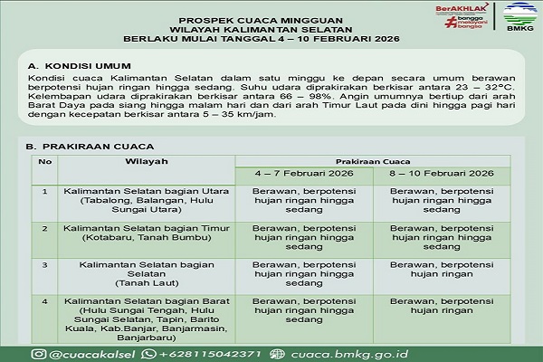 BANJARBARU, Kalimantanlive.com – BMKG Stasiun Meteorologi Syamsudin Noor Banjarbaru merilis Prospek Cuaca Mingguan wilayah Kalimantan Selatan yang berlaku pada 4–10 Februari 2026. Secara umum, cuaca di Kalsel diprakirakan berawan dengan potensi hujan ringan hingga sedang.
