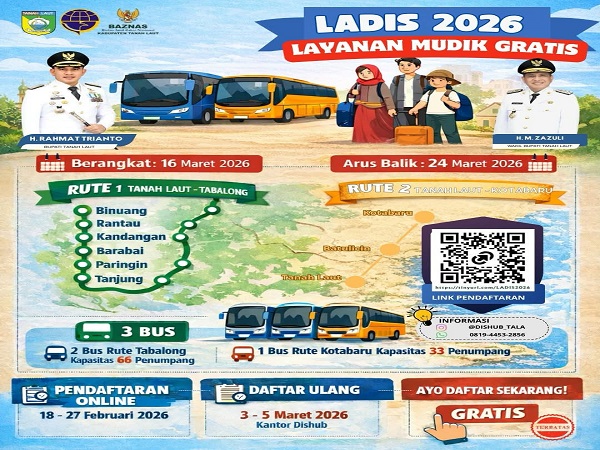 PELAIHARI, Kalimantanlive.com – Pemerintah Kabupaten Tanah Laut (Tala) kembali menggulirkan Program Layanan Mudik Gratis (LADIS) 2026 dengan peningkatan signifikan pada cakupan rute dan wilayah layanan.