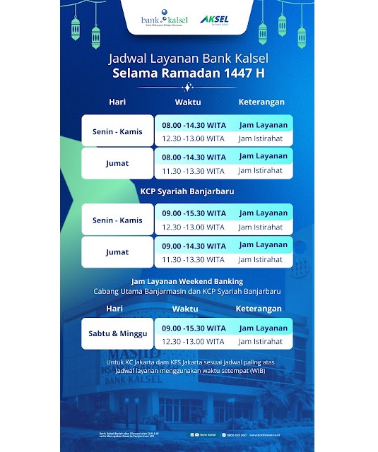 BANJARMASIN, Kalimantanlive.com — Menyambut bulan suci Ramadhan 1447 H/2026 M, Bank Kalsel mengumumkan penyesuaian jam operasional layanan untuk memastikan kelancaran dan kenyamanan nasabah dalam bertransaksi.