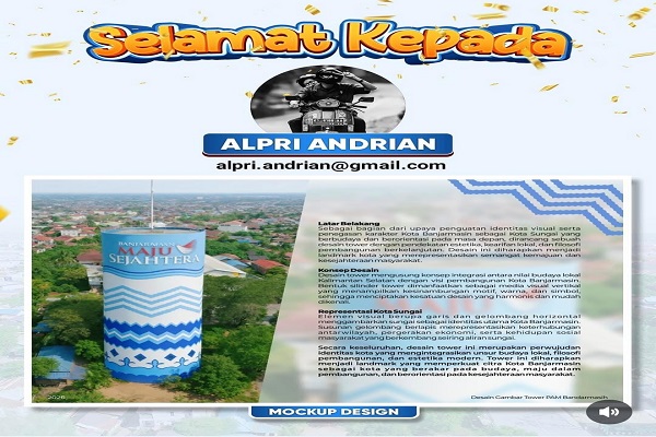 BANJARMASIN, Kalimantanlive.com – PT Air Minum Bandarmasih resmi mengumumkan pemenang sayembara re-desain Tower PAM Bandarmasih yang terletak di Jalan Sutoyo S, Kota Banjarmasin. Pemenang sayembara ini adalah Alpri Andrian, yang berhak menerima hadiah senilai enam juta rupiah.