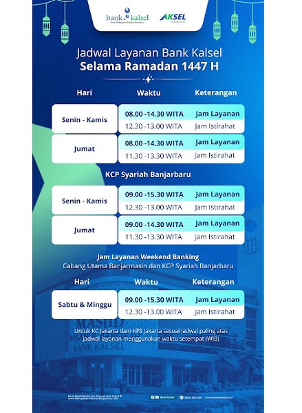Bank Kalsel mengimbau seluruh nasabah untuk menyesuaikan jadwal kunjungan selama bulan suci agar pelayanan lebih nyaman dan efisien.