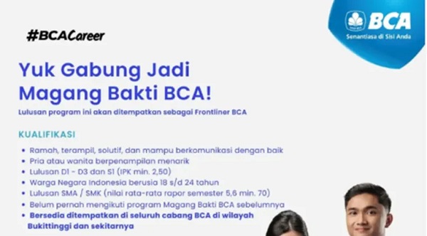BUKITTINGGI, Kalimantanlive.com – Kesempatan berkarier di sektor perbankan kembali terbuka bagi generasi muda. PT Bank Central Asia Tbk (BCA) membuka lowongan kerja untuk posisi Frontliner yang akan ditempatkan di wilayah Bukittinggi dan sekitarnya.