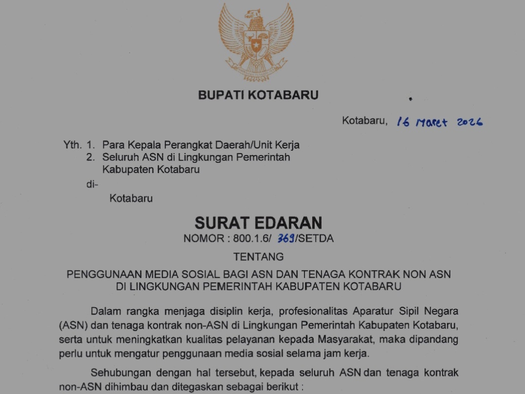 KOTABARU, Kalimantanlive.com – Pemerintah Kabupaten (Pemkab) Kotabaru resmi menerbitkan Surat Edaran Nomor 800.1.6/369/SETDA yang mengatur penggunaan media sosial bagi Aparatur Sipil Negara (ASN) serta tenaga kontrak non-ASN di lingkungan Pemkab Kotabaru.
