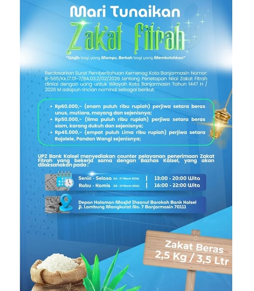 Bekerja sama dengan Baznas Kalsel, Bank Kalsel menyediakan counter pelayanan zakat fitrah yang akan dibuka di Halaman Masjid Ihsanul Barokah Bank Kalsel, Jalan Lambung Mangkurat No. 7 Banjarmasin 70111, dengan jadwal:
