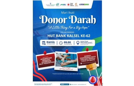BANJARMASIN, Kalimantanlive.com – Membanggakan, dalam rangka memperingati Hari Ulang Tahun (HUT) ke-62, Bank Kalsel bakal melaksanakan kegiatan donor darah bertema “A Little Thing For a Big Hope”.
