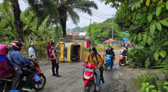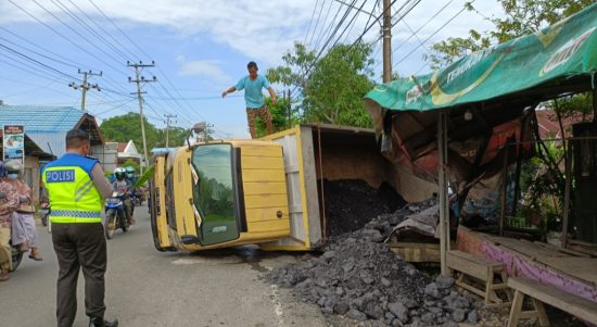 KOTABARU, Kalimantanlive.com – Sebuah mobil truk dump membawa pasir mengalami kecelakaan tunggal