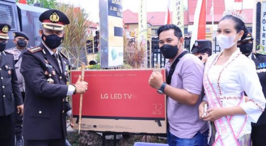 BANJARMASIN, Kalimantanlive.com – Kapolresta Banjarmasin Kombes Pol. Sabana menyerahkan undian vaksinasi merdeka